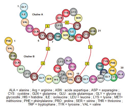 L’insuline bovine se distingue de l’insuline humaine par trois aminoacides.
